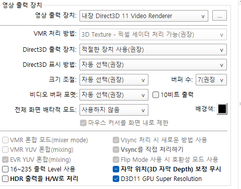 - 영상 - 영상 출력 장치 - 내장 Direct3D 11 Video Renderer를 선택해 줍니다.