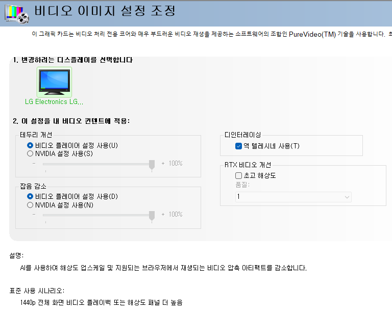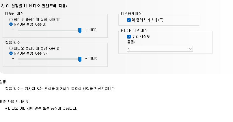 - 옆에 있는 테두리 개선, 잡음 감소의 경우 비디오 플레이어 설정 사용으로 두셔도 무방하나 NVIDIA 설정 사용을 통해 적용 수위를 조절할 수 있습니다.